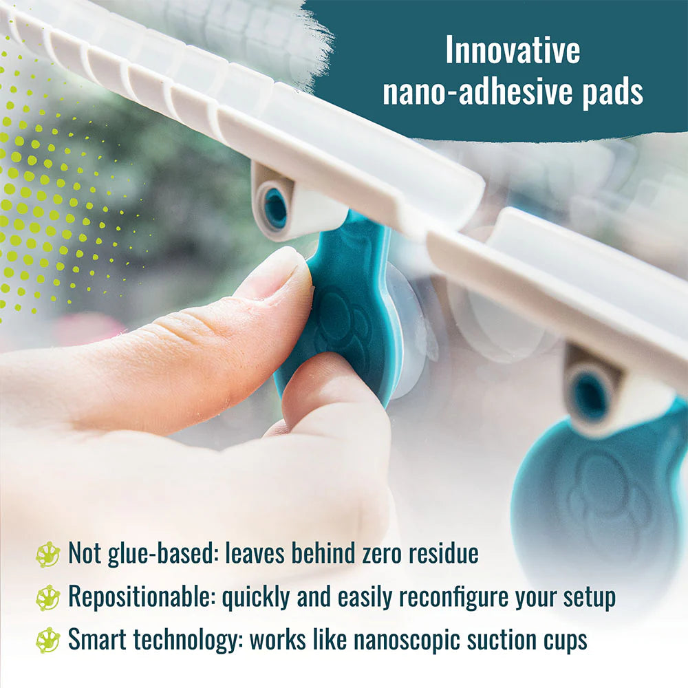 Attach the tracks to surfaces with the help of clever nano pads, which work like nanoscopic suction cups, to create a strong, but temporary bond. Because the pads are not glue-based, they can be quickly and easily repositioned many times without damaging adhesives or sticky residue. A quick wipe with a microfiber cloth will keep your pads ready for action!