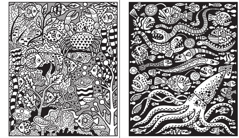Brush water over the stylish, black and white patterns and underwater scenes and watch the vibrant colours magically appear to reveal sharks, sea turtles, jellyfish, a school of tropical fish and lots more. There’s a handy flap at the back of the book to stop paint seeping through to the page below and 16 detailed scenes to paint.