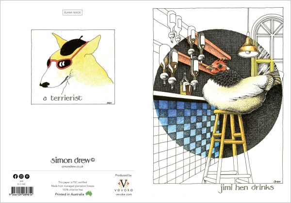 A chord of humour and creativity — Simon Drew’s Jimi greeting card hits all the right notes! Featuring the English artist’s distinctive line illustration and playful pun, this design pays cheeky homage to rock legends and lovers of wordplay alike.