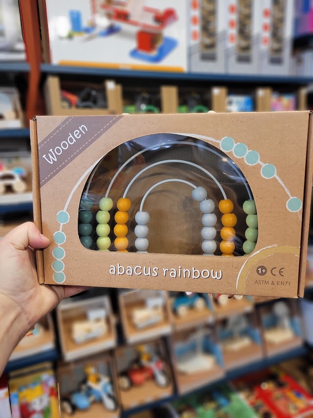 An abacus with a difference - solid natural timber base with arched wires threaded with timber beads, finished in non-toxic paint, in subtle modern tones. These not only look great but will help a child to develop fine motor skills and learn to count, add and subtract.